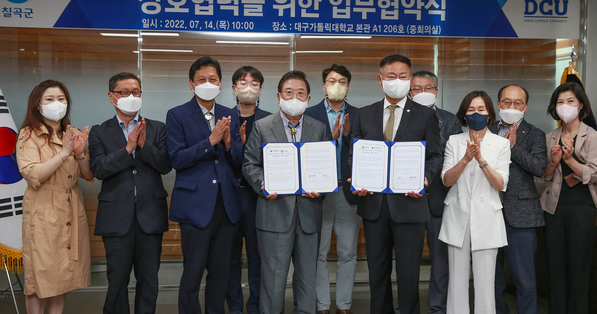 우리 대학과 칠곡군(군수 김재욱)은 7월 14일 본관에서 인문도시지원사업 수행을 위한 업무협약을 체결했다. 양 기관은 △상호 이해와 협력 증진을 위한 교류 △취·창업을 위한 평생교육 과정 등 프로그램 개발 및 운영 △한국연구재단 인문도시지원사업 수행을 위한 상호 협력 △지역사회 상생발전을 위한 공동 연구과제 개발 및 수행 등을 약속했다.