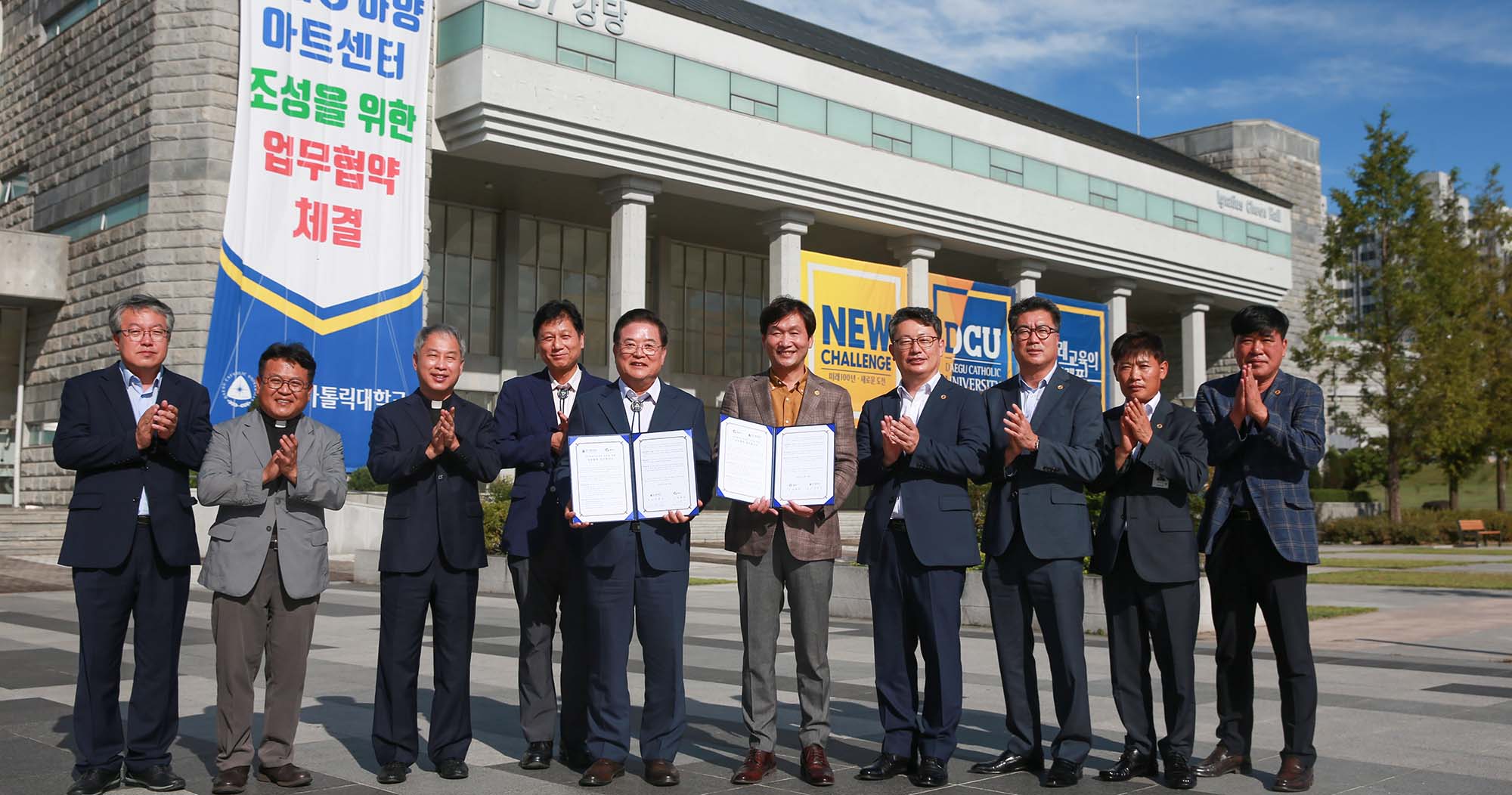 우리 대학과 경산시(시장 조현일)는 9월 19일 ‘DCU하양아트센터’ 건립을 위한 업무협약을 체결했다. 양 기관은 우리 대학 강당을 ‘DCU하양아트센터’로 리모델링하여 대학과 지역 상생 문화공간으로 조성하는 사업을 추진하기로 합의했다. 이를 위해 △대학 내 지역 문화공간 조성을 위한 공동 노력 △주요 행사 공동 개최와 지원을 위한 교류 활성화 △지역 상생발전을 위한 공동 과제 개발 및 수행을 약속했다.
