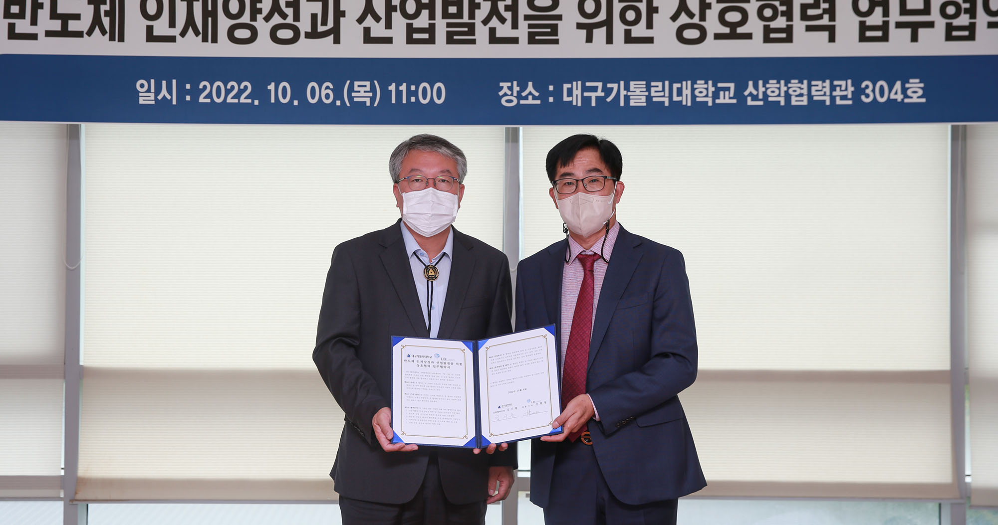 우리 대학과 ㈜LB루셈(대표이사 신현창)이 10월 6일 산학협력관에서 반도체 인재양성과 산업발전을 위한 상호협력 업무협약을 체결했다. 양 기관은 △기술 개발과 인재 양성을 위한 인적·물적 지원 △반도체 산업 우수인재 육성과 확보를 위한 상호협력 △반도체 산업의 발전과 활성화를 위한 과제발굴과 사업추진 △지역산업 상생발전을 위한 공동 연구과제 개발 및 수행 등을 약속했다.